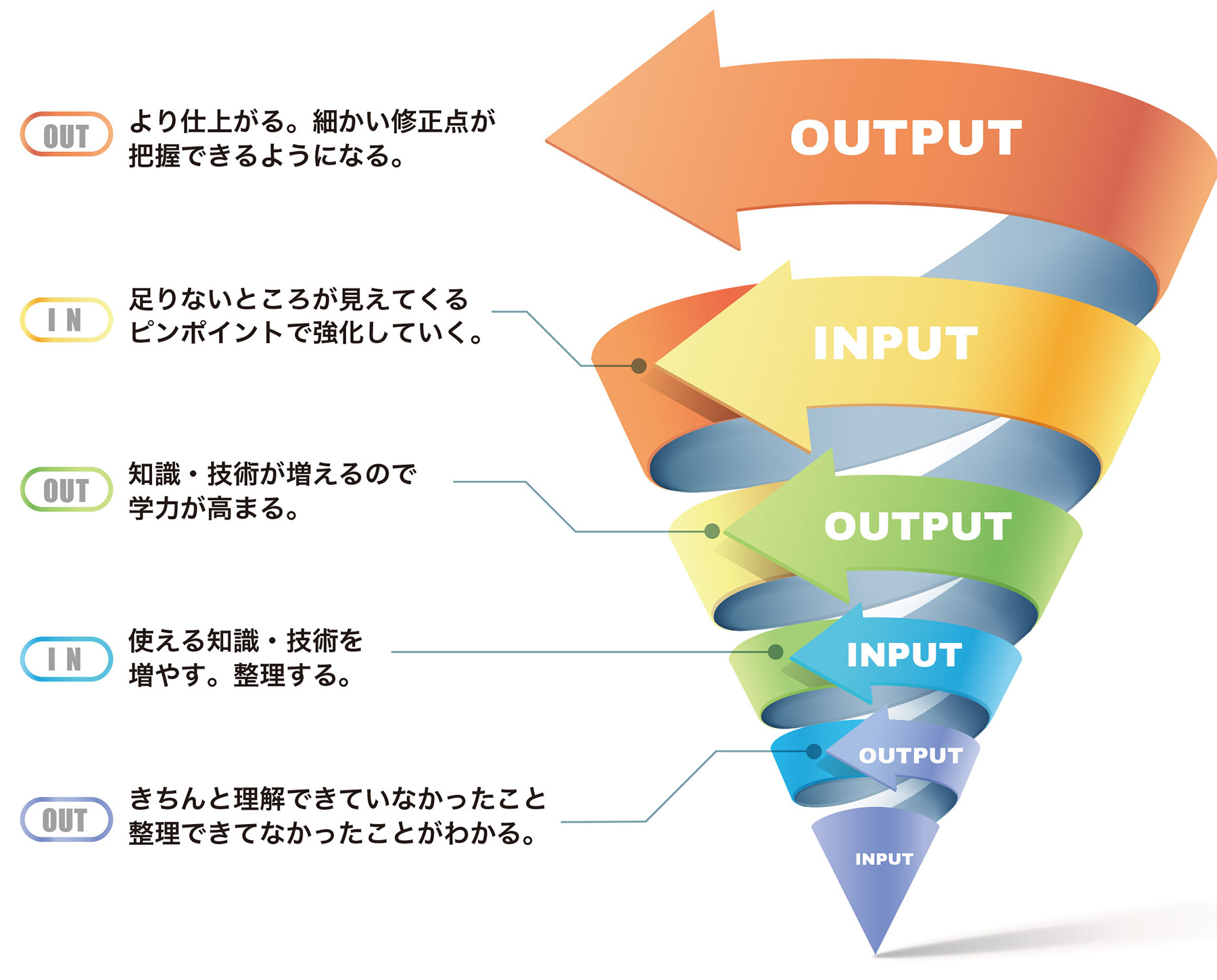 OUTPUTを増やしていくことで、重要なこととそうではないものの区別が把握でき、その単元のもつ「出題のくせ」が掴めるようになってきます。そして何回も出題される問題を通して理解の強化が行われます。未経験の問題にぶつかったら、解法を確認していく事によって事によって解答技術の引き出しが増えていくのです。また、試験範囲を俯瞰してみることができるようになるため、自分の得意なところと仕上がってないところが見えるようになってくるのです。そうなると、今度は足りないところを強化するINPUTして〜というサイクルに入っていきます。学力の輪はどんどん大きくなっていくのです。