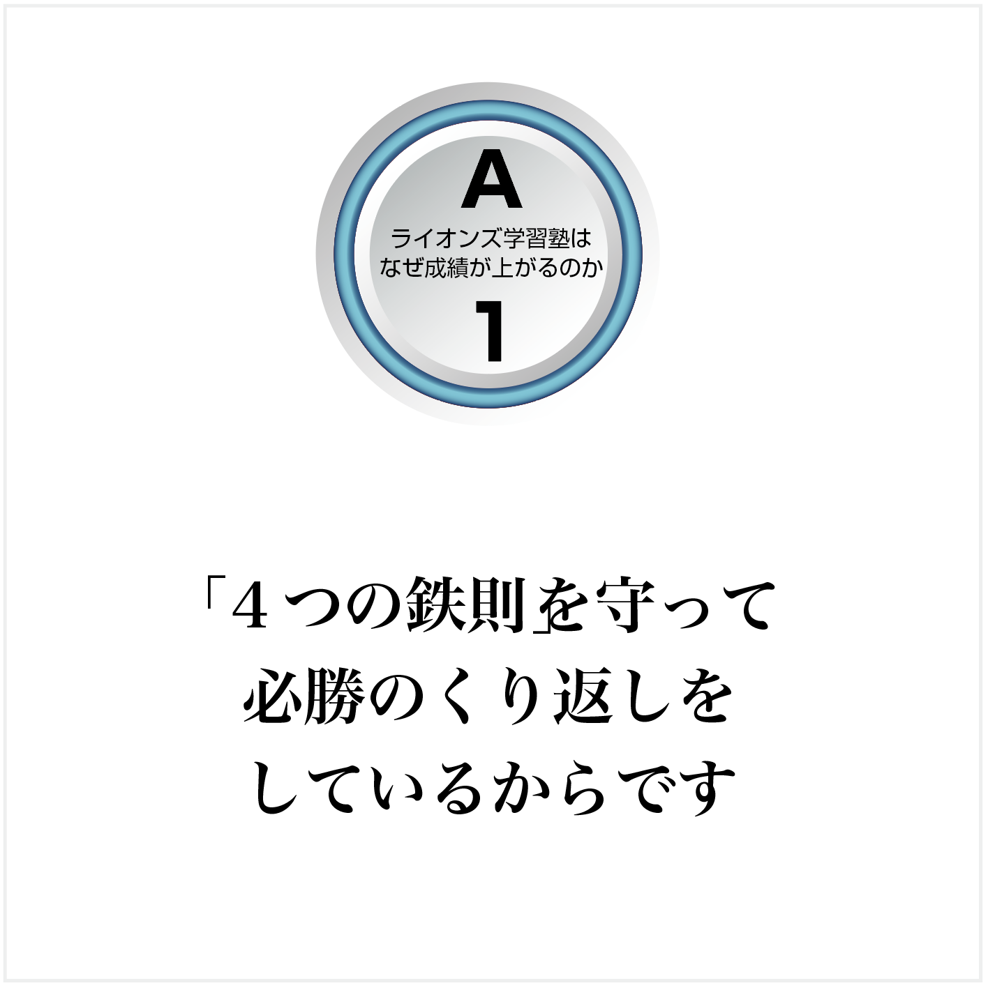 ライオンズ学習塾は、とにかく学習内容を『イッキに!』やらせようとします。「すすんでいる」というスピード感と「全部でこれだけ」という安心感は子どもたちに意欲を与えるからです。例えば理科の基本は3年分を3日で抑えていこうとします。取り組みの散漫さを嫌い、焦点を絞って基本の定着を目指します。